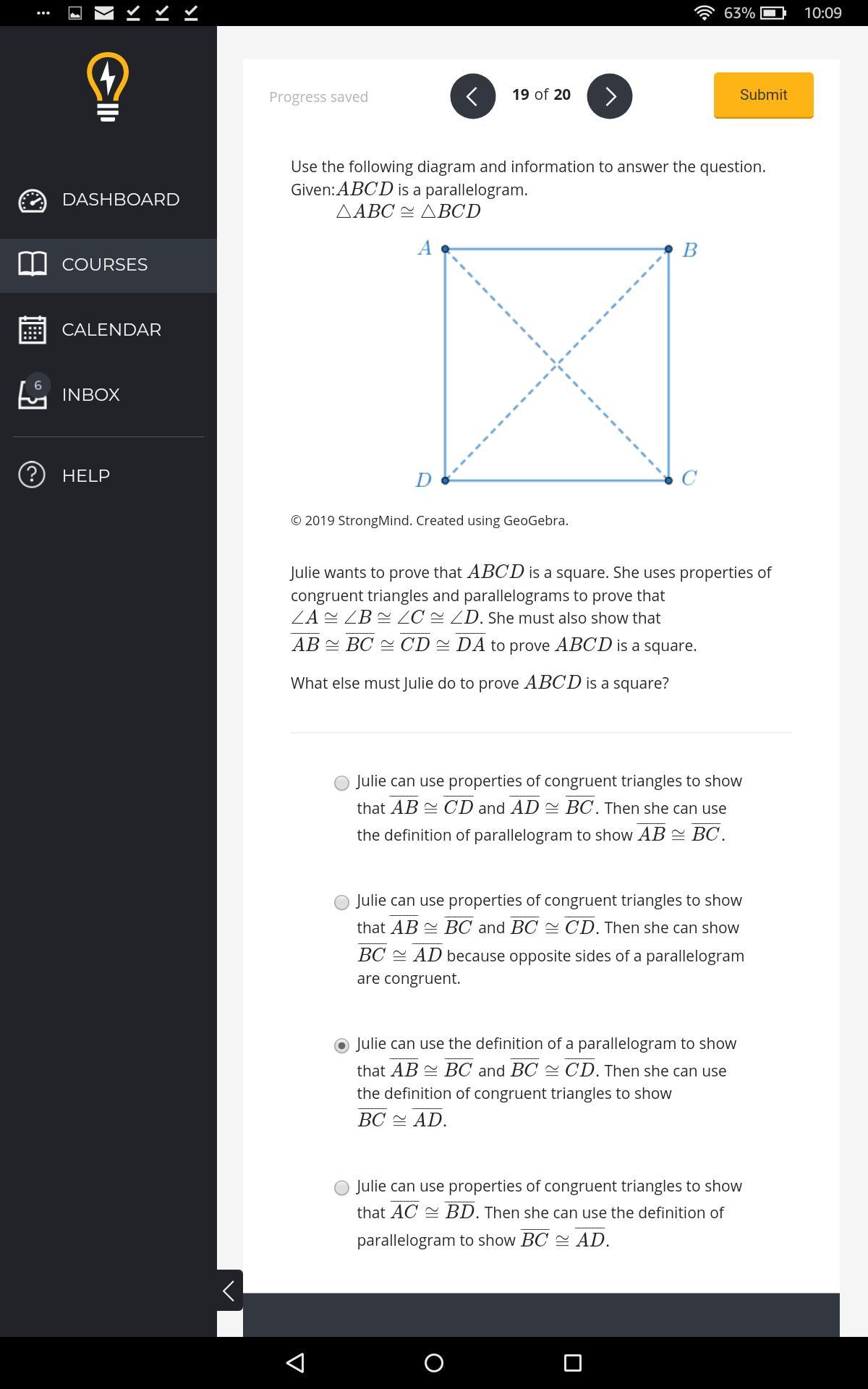 ABCD is a parallelogram, Julie wants to prove that ABCD is also a square.