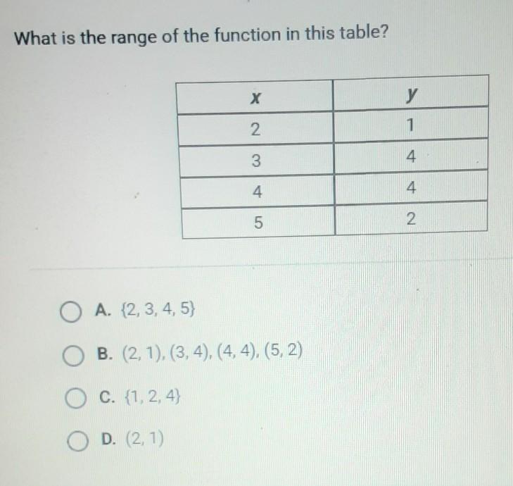 According to the table, the numbers under the 'y' column are 1, 4, 4, and 2. Therefore, the range is: {1, 2, 4}.
