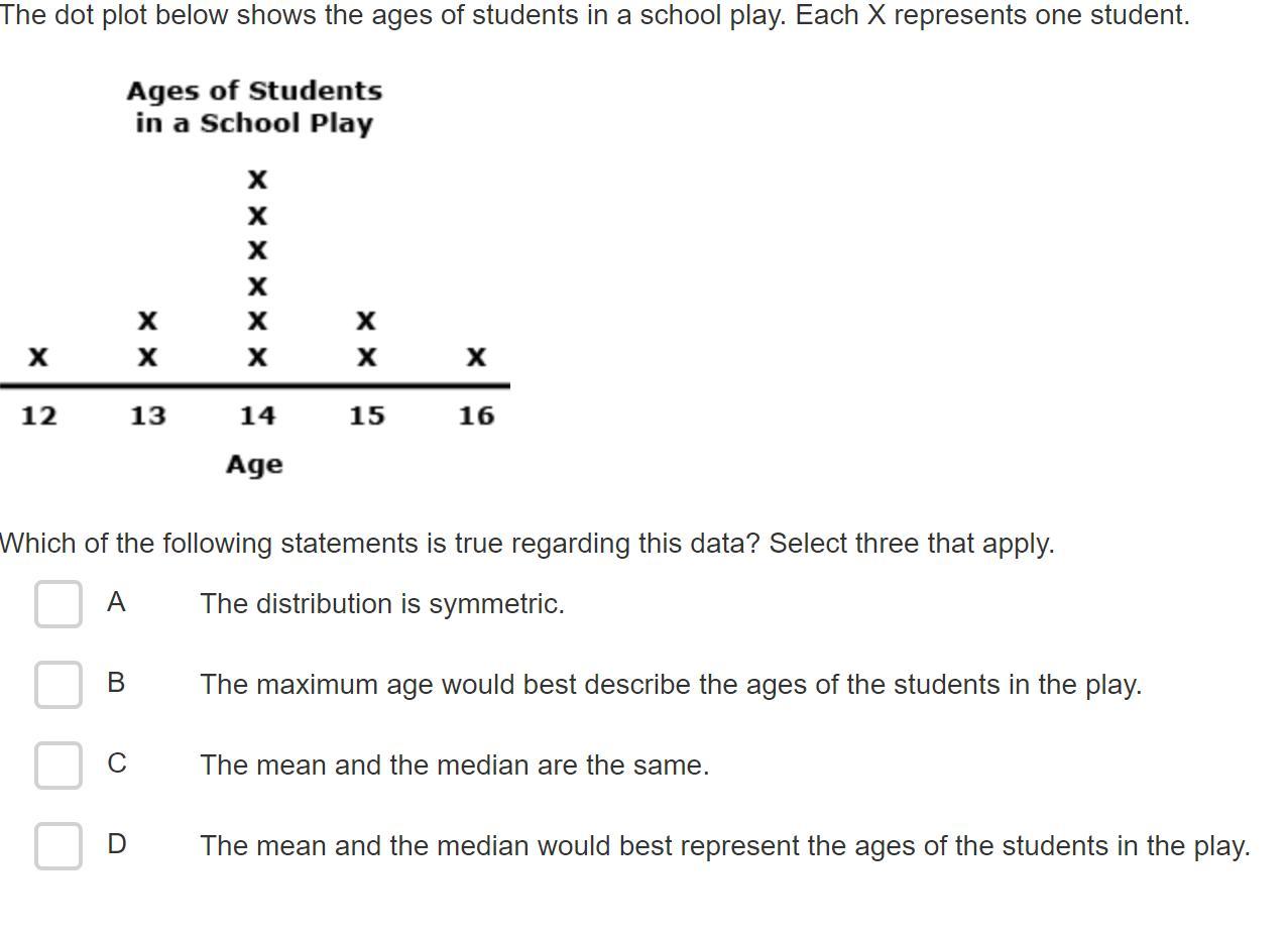 D: Because the mode (or most common number) would also be 14, we can conclude instantly that the 14 we got from the mean and median is the best representation of students in the play. D is also true.  As far as the best measure of center goes, I usually prefer the mean, but it is almost entirely situational.