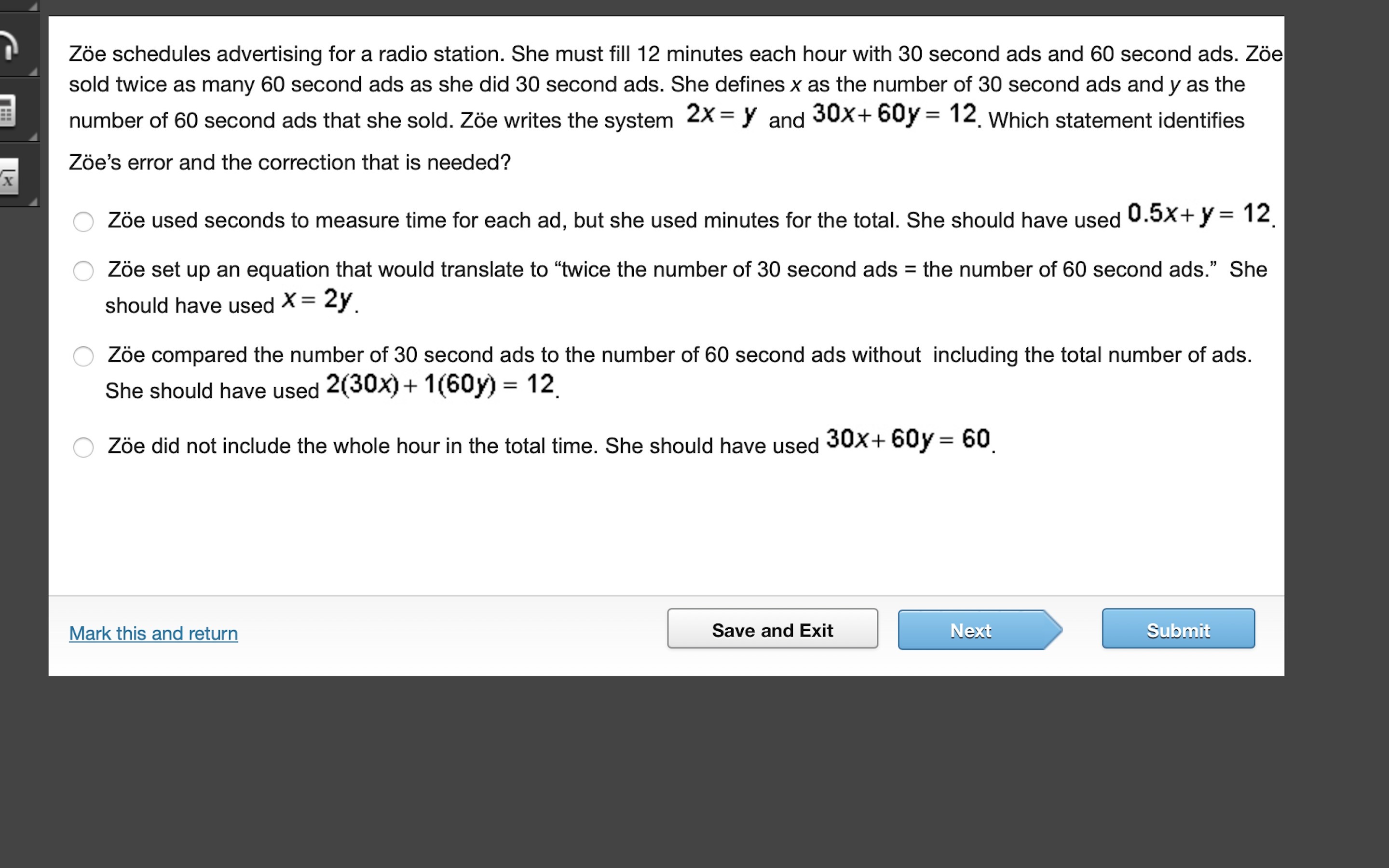 A) Zoe used seconds to measure time for each ad, but she used minustes for the total. She should have used 0.5x+y=12.