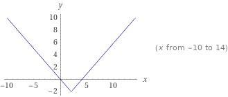 An absolute value graph at (0, 0) is an up facing V shape graph. After a few transformation, according to the equation y = −2 + |x− 2|, we have our vertex at (0, - 2). It remains at up facing V graph.
