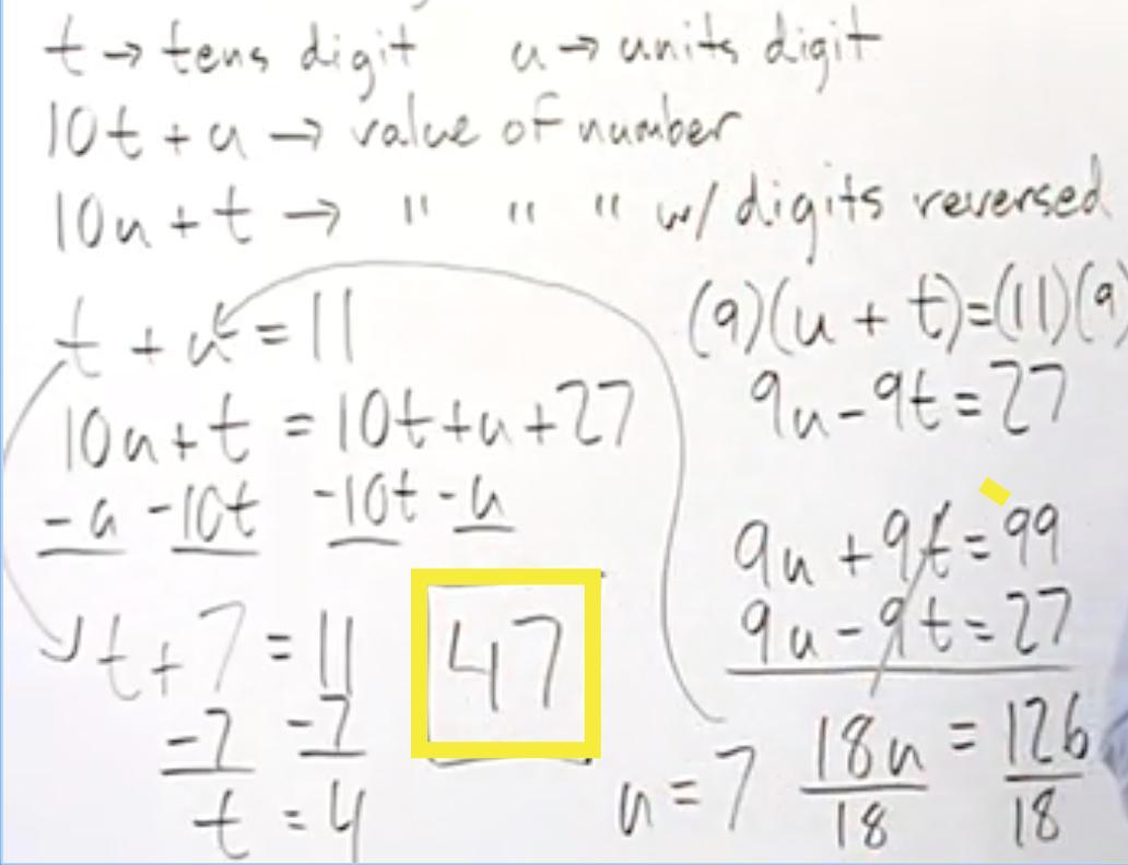 Step-by-step explanation: To solve this problem, let's use <em>t</em> to represent our tens digit and <em>u</em> to represent our units digit so that the value of our number can be represented as 10<em>t</em> + <em>u</em>.