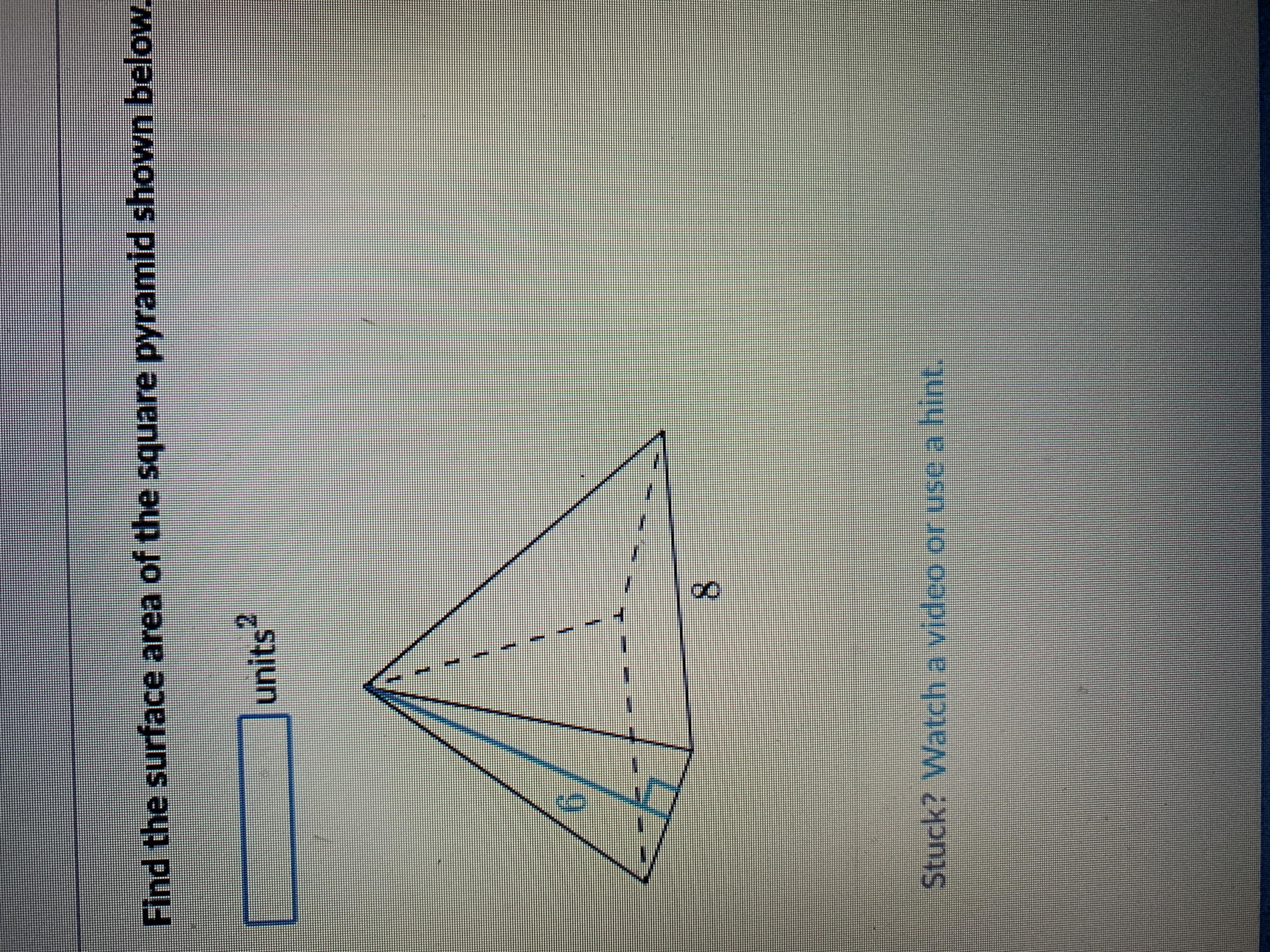 The way we solve it is since we are trying to find the surface area of a square pyramid, we add the surface area of all four sides, plus the 2D square that is the base of the pyramid.