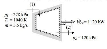 Air modeled as an ideal gas enters a turbine operating at steady state at 1040 K, 278 kPa and exits at 120 kPa. The mass flow ra