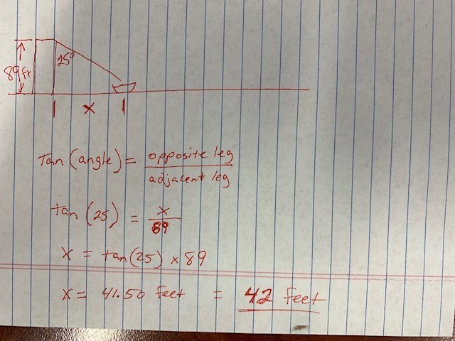 We know that the boat makes an angle of depression of 25° from the top of a lighthouse and the height of the lighthouse is 89 feet.
