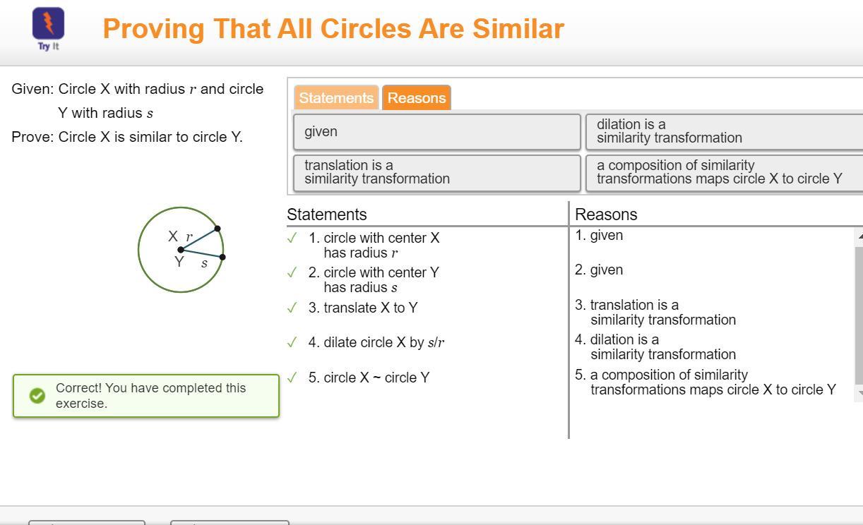 Now the two circles have the same center and the same radius, and thus they are the same. We just proved that any two circles can be reduced to be the same circle using only translations and scaling, which generate similar shapes.