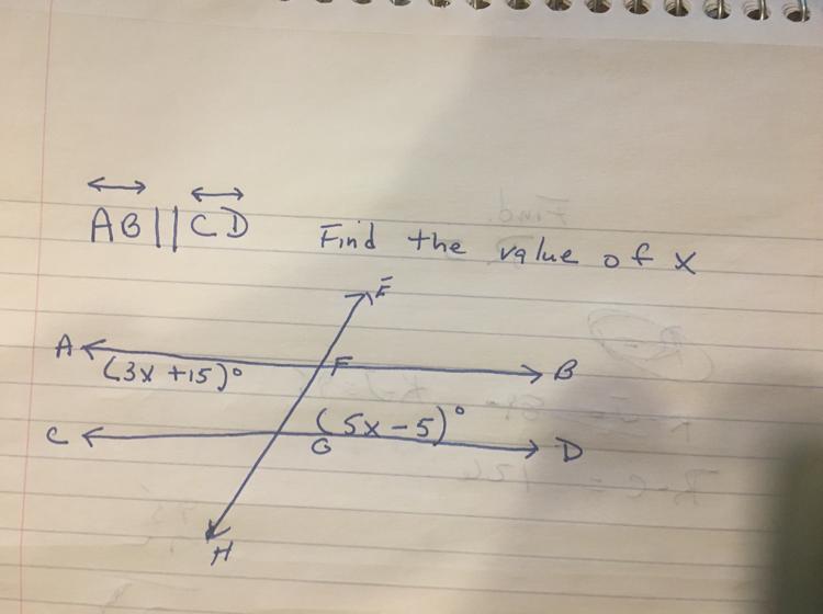 Given that the lines AB and CD are parallel, we are to find the value of x.