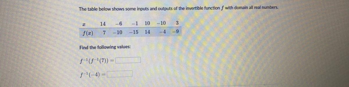 f(x) is a function where we plug in the given row of x values to have them lead to the corresponding f(x) values in the table. We see that x = 14 leads to y = f(x) = 7. Going backwards, we can say