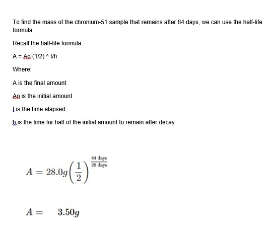 The isotope chromium-51 has a half-life of 28 days. if the original sample had a mass of 28.0 grams, what mass of the chromium-5
