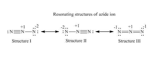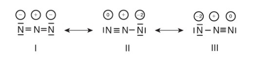 Keywords: resonating structures, azide, N3-, structure I, structure II, structure III, Lewis structures, smaller, larger, electronegative atom.