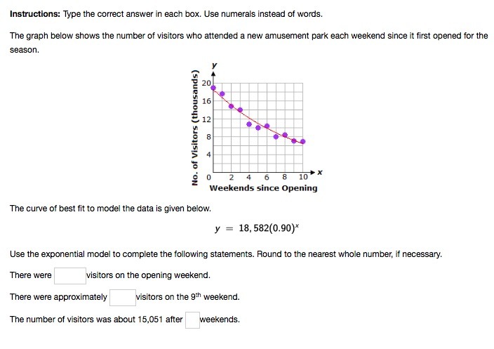 2. Just like before, to find the approximate number of visitors on the ninth weekend, we just need to replace with in our exponential equation: And rounded to the nearest integer: