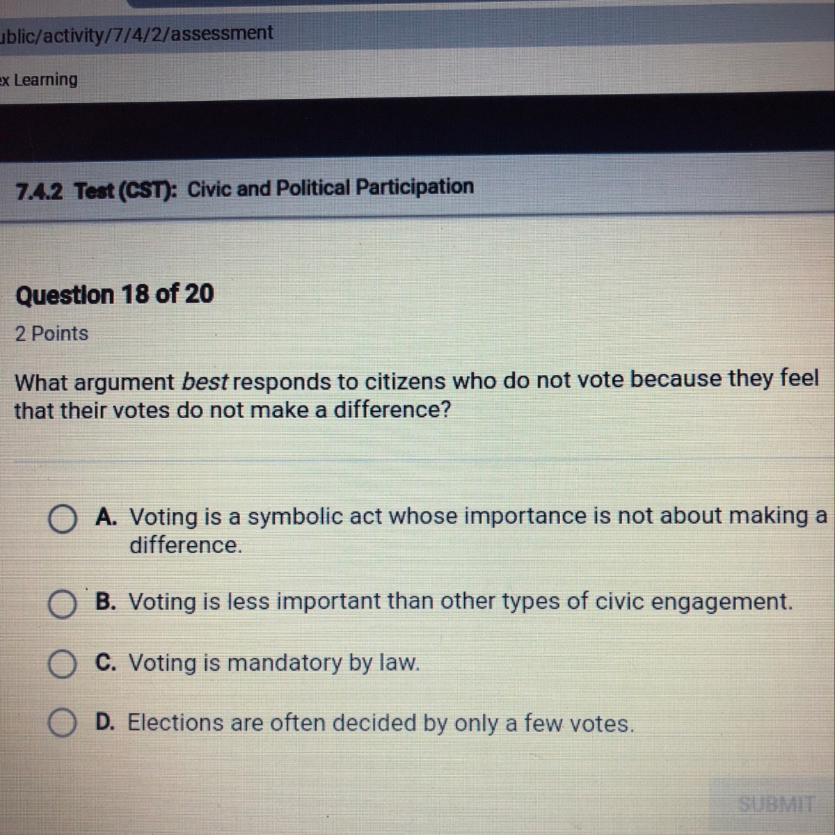 Besides, option A is incorrect because voting doesn't aim to symbolize an act, but to choose a leader who will express him/her ideology through the creation of policies that will determine a country's present and future.