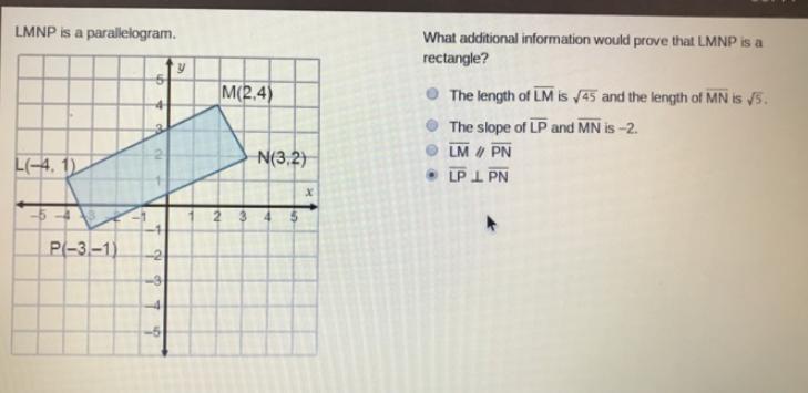 A rectangle is a four-angle parallelogram, so to demonstrate that LMNP is a rectangle, we must prove that LP is perpendicular to PN.