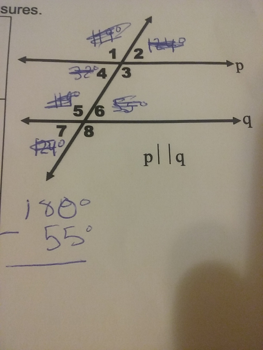 5. Angle 5 and angle 1 are the same 119 degrees 6. if angle 7 is 124 degrees then angle 2 is 56 degrees 7. if angle 6 is 5 degrees then angle 3 is 175 degrees 8. If angle 4 is 32 degrees then angle 1 is 148 degrees The picture is not to scale it is just a guide