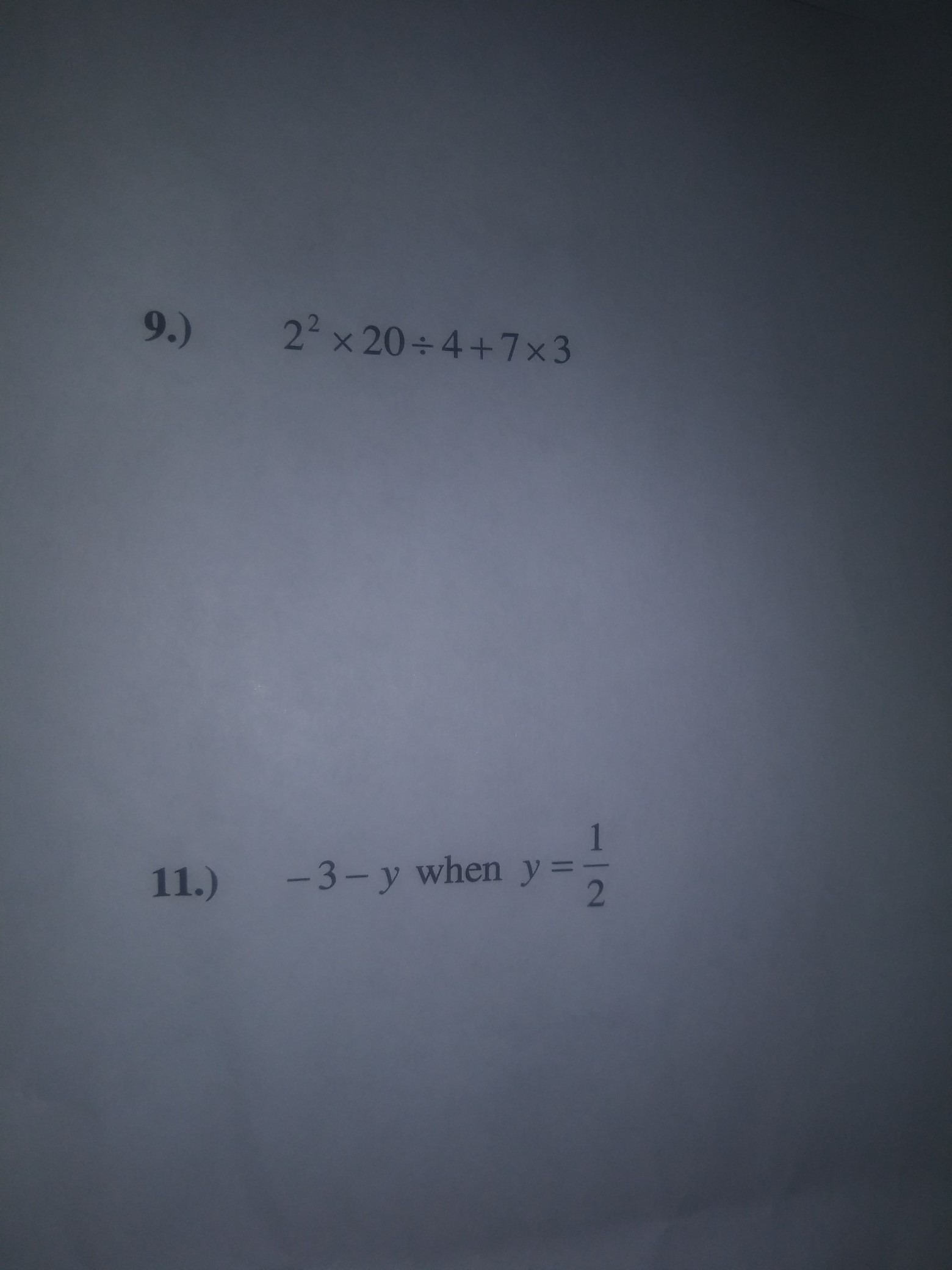 2 to the second power times 20÷4+7×3 and -3-y when y= 1/2