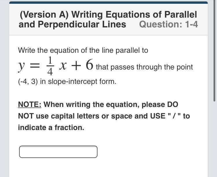 So the equation of the parallel line using point (-4 , 3) and slope 1/4 is