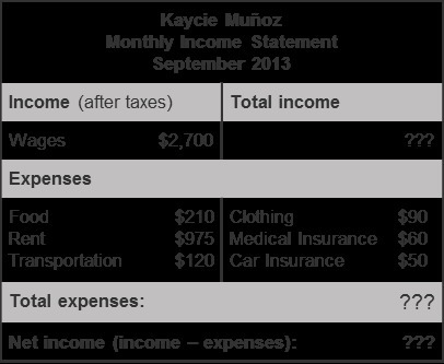 Kaycie's expenses are on food, rent clothing, transportation, medical and Insurance.