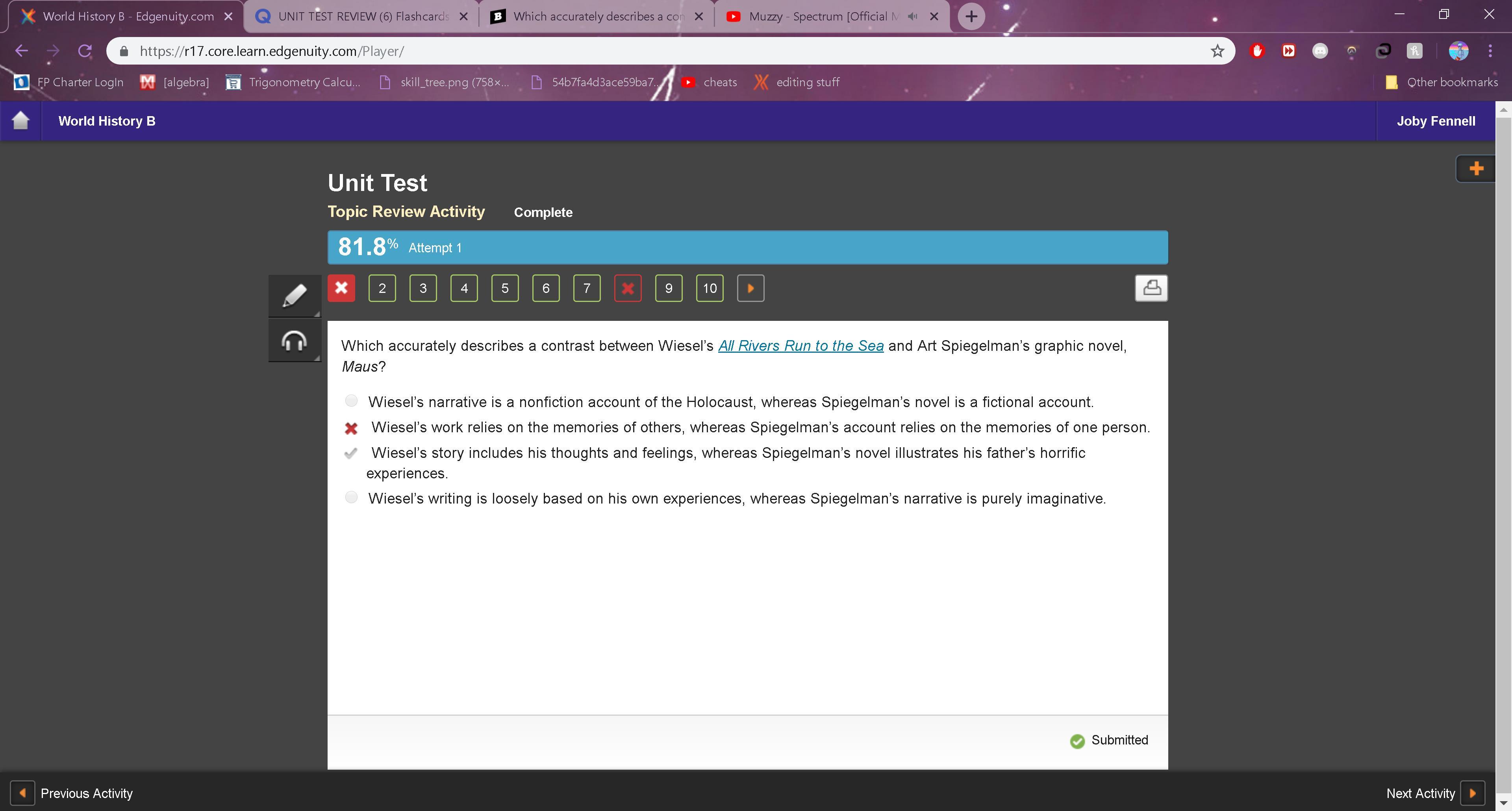 The option that most accurately describes a contrast between Wiesel’s "All Rivers Run to the Sea" and Art Spiegelman’s graphic novel, "Maus" is "Wiesel’s story includes his thoughts and feelings, whereas Spiegelman’s novel illustrates his father’s horrific experiences."