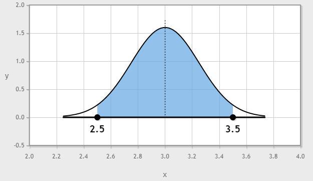 P ( 2.5 < X < 3.5 ) =P ( 2.5−3 < X−μ < 3.5−3 )