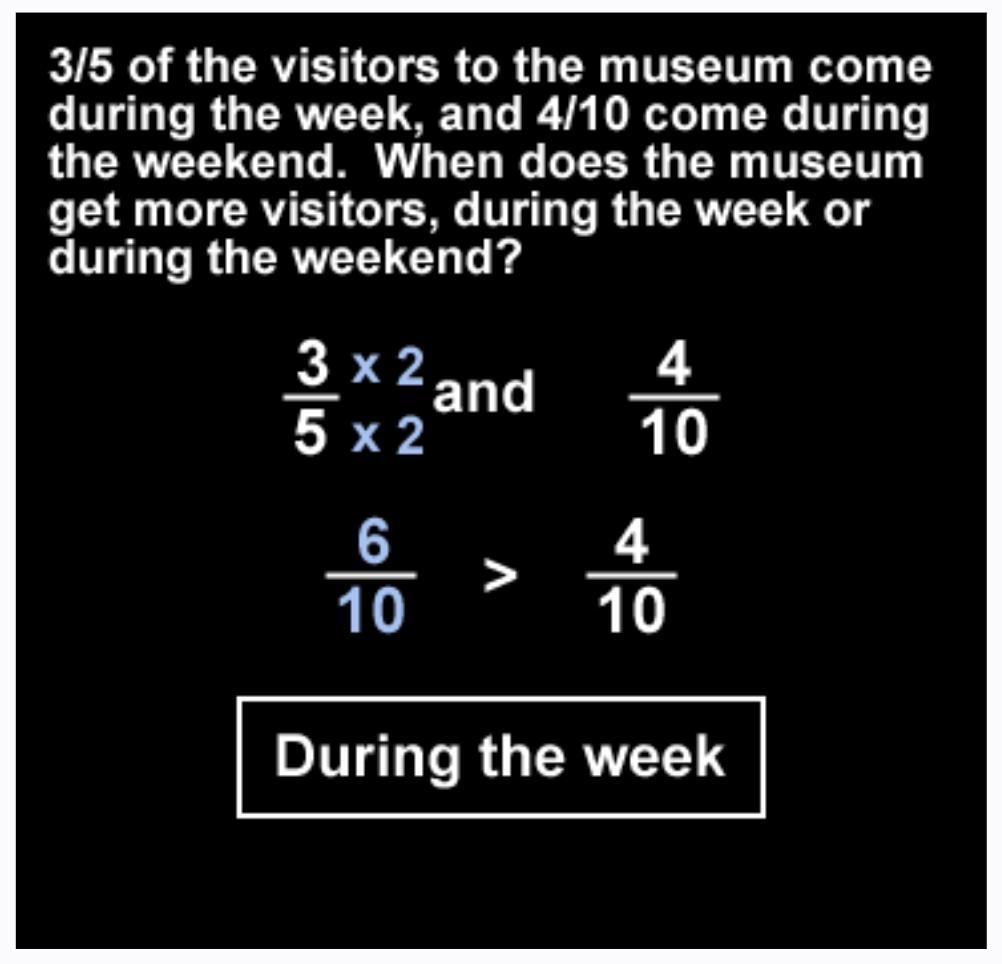 <em><u>3/5 of the visitors to the museum come during the week, and 4/10 come during the weekend. When does the museum get more visitors, during the week or during the weekend.</u></em>