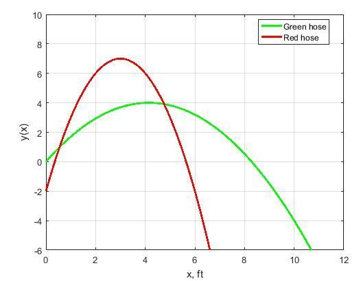 The red hose has a vertex at (3,7), according to the equation y = -(x-3)² + 7.