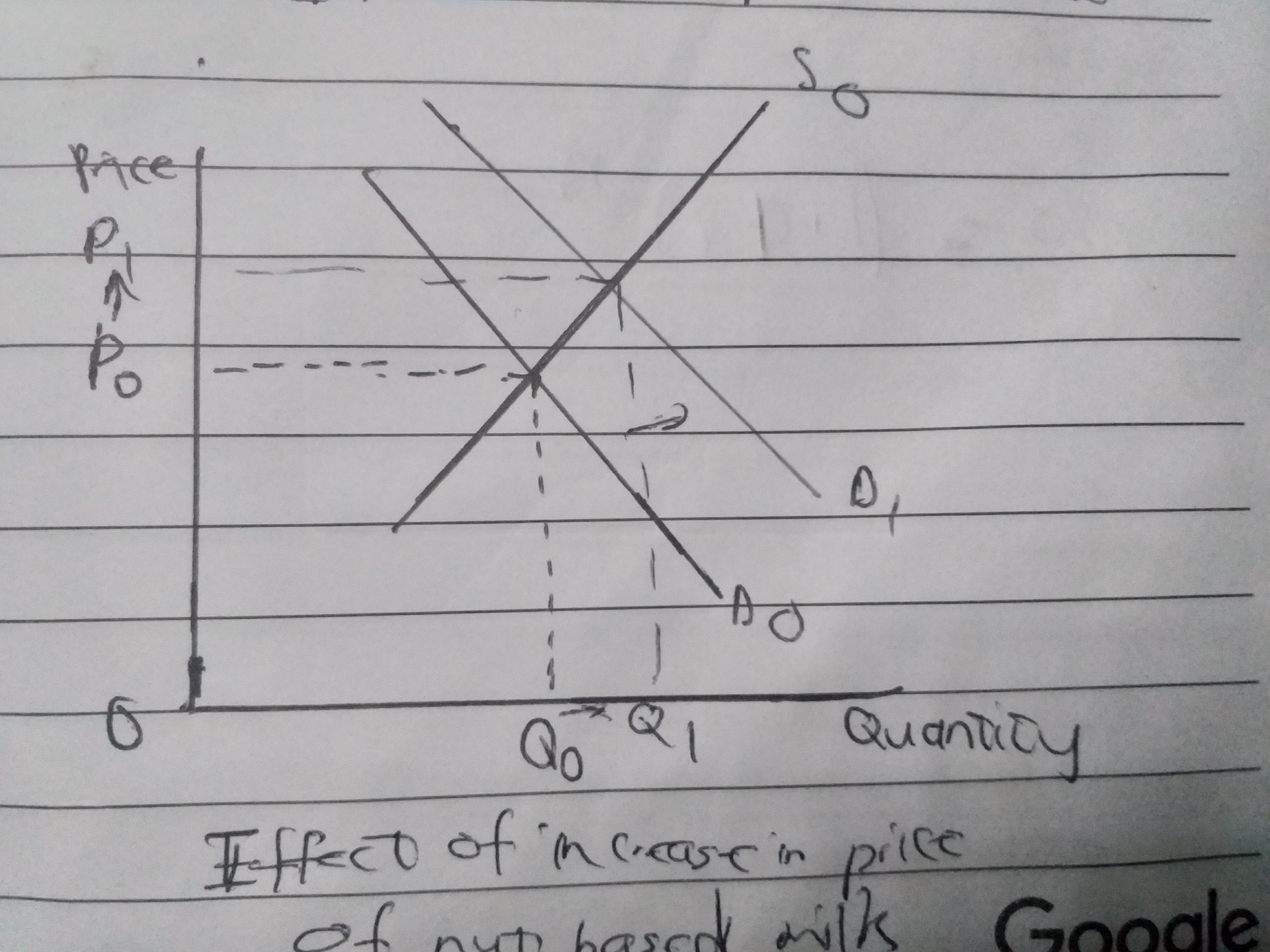 If the price of nut based milk, a substitute for diary milk increases, nut based milk becomes more expensive for consumers and as a result consumers would increase their demand for diary milk. This would lead to an outward shift of the demand curve and as a result, equilibrium price and quantity of diary milk will increase