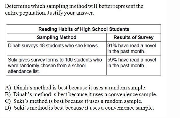 I think the correct answer is C) Suki's method is best because it uses a random sample Glad I could help, and good luck! AnonymousGiantsFan