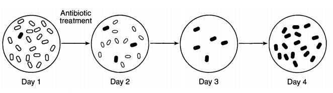 - Day 1 ⇒ a big population of white bacteria and only one black cell, probably <em>carrying mutated genetic material</em>.