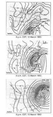 The figures below are surface weather maps from Superstorm 1993, which produced blizzard conditions across much of the eastern U