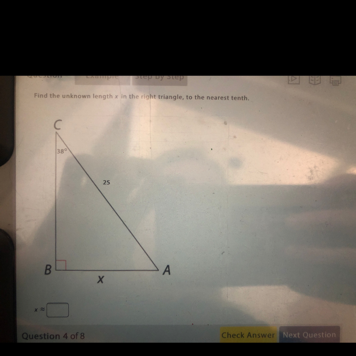 2. You know the angle 38° and the lenght of the hypotenuse. Therefore, you can calculate the lenght x as following: