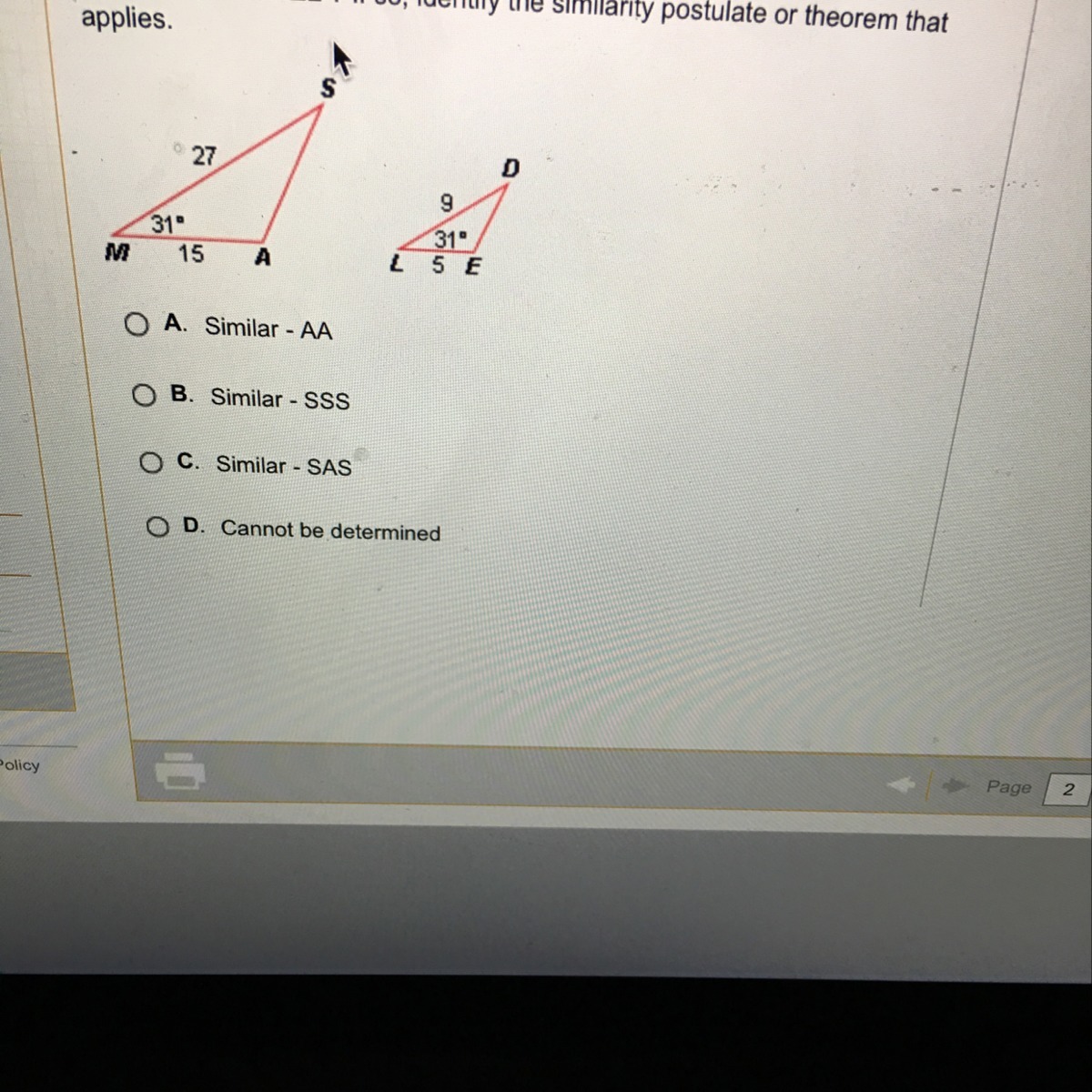 From the given figure, SM=27, DL=9, MA=15, LE=5 and ∠M=∠L=31°, we have to identify the similarity postulate that applies.Thus,