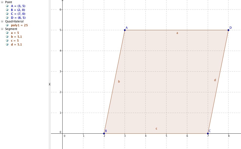 It is given that A quadrilateral has vertices A(3, 5), B(2, 0), C(7, 0), and D(8, 5).
