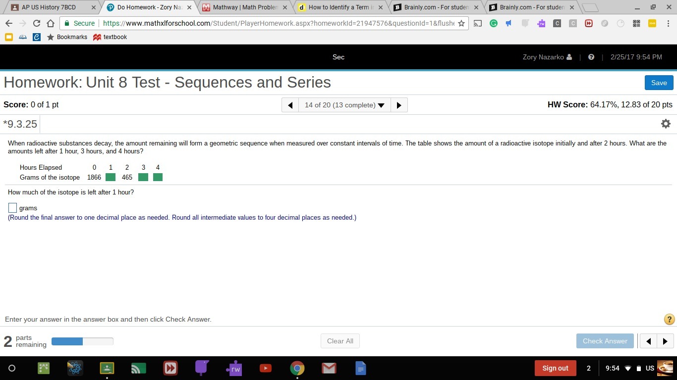 I am not sure because there is no info about what is rate of decay I assume if there is rate of decay is constant every hour then 0-2 it is It 1/4th So for 1st hour it is 933 gram