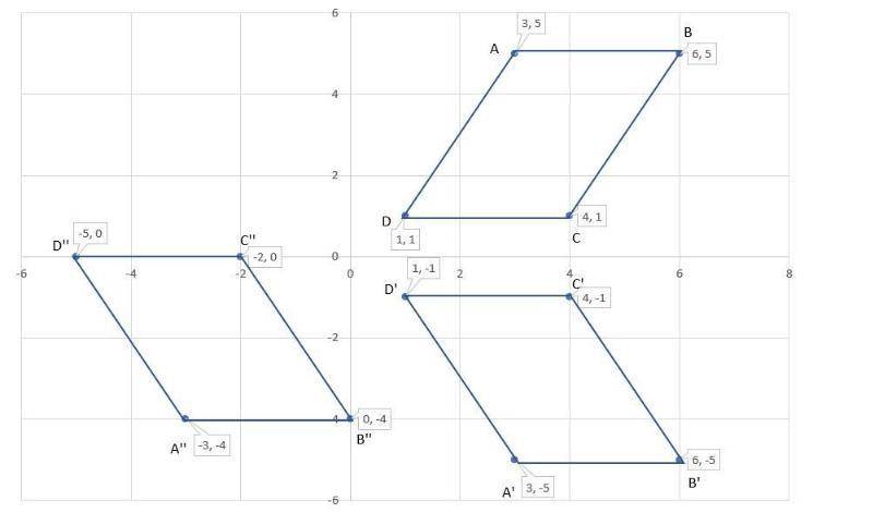 The coordinates of the parallelogram A'B'C'D' are; A'(3, -5), B'(6, -5), C'(4, -1), D(1, -1)