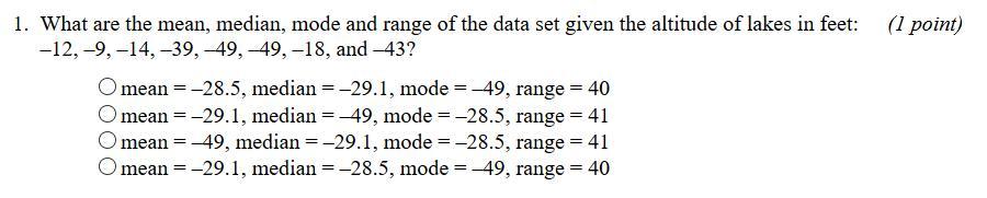 Answer: mean -29.1, median -28.5, mode -49, range 40; last choice