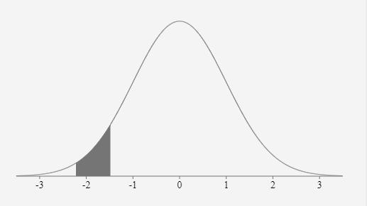 P(-2.22 \leq x \leq -1.49) = P(\displaystyle\frac{-2.22 - 0}{1} \leq z \leq \displaystyle\frac{-1.49-0}{1}) = P(-2.22 \leq z \leq -1.49)\\\\= P(z \leq -1.49) - P(z < -2.22)\\= 0.0681 - 0.0132 = 0.0549