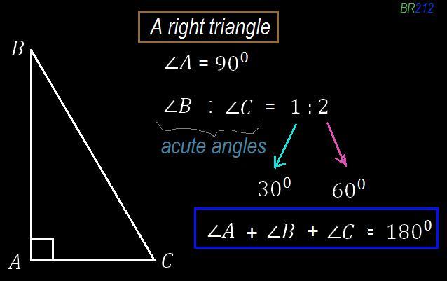 Keywords: Angle, triangle, ratio, measure, right angled triangle, 30 degree, 60 degree, acute angle, summation, equation, rearrangement, 90 degree, perpendicular, vertical, horizontal, equation, value.