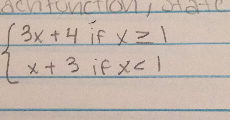 So we look at the conditions if x<1 and if x≥1 x<1 means x is less than 1 x≥1 means x is greater than 1 including 1 that includes all real numbers so domain is all real numbers range is (sart with top and go up, if x=1 then f(1)=7 so from 7 to infinity, then other one, x<1, -inifinity to 4 not including 4 so the range with interval notation is (-∞,4) U [7,∞) graph is the graph of each, but pt together (see attachmetn)