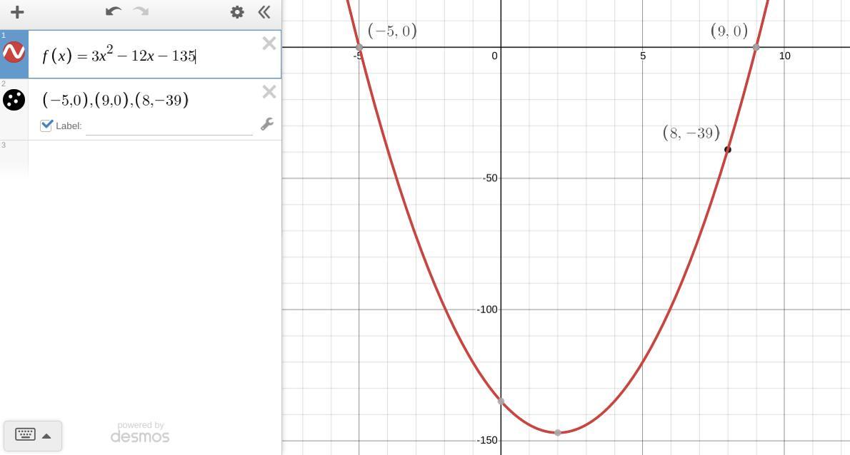 We will use the x and y values from each of our 3 points to find a, b, and c. Filling in the x and y values from each point: