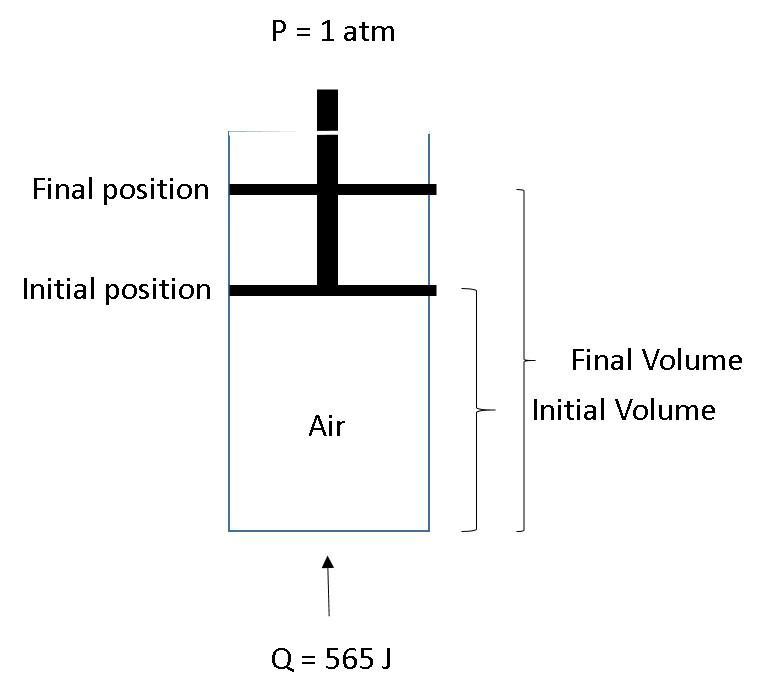 1) q= 565 J (a positive value because the enviroment delivered heat to the cylinder)