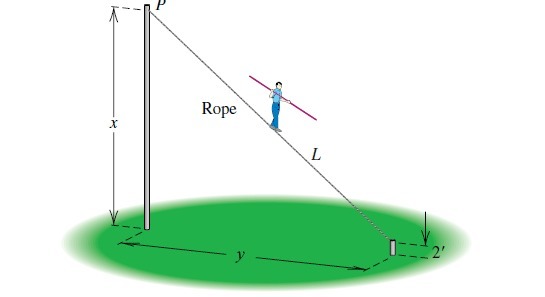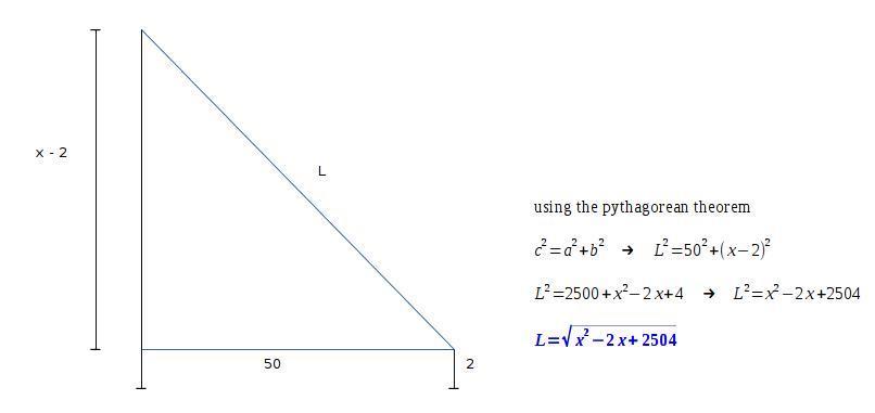 Since L is to the second pole, not x, we can't simply say that x^2+y^2=l^2 using the Pythagorean Theorem. We can, however, say that (x-2)^2+y^2=L^2 due to that we simply increase the original height by 2, decreasing x by 2. Plugging 50 as y in, we get (x-2)^2+50^2 =L^2. Square rooting both sides, we get L=sqrt((x-2)^2+50^) and therefore a function of x
