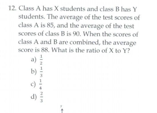 There's a quick way to work mixture problems of all kinds. Write the two components of the mixture on the left. Here, they are 90 and 85. (I usually put the larger one on top.) Put the mixed value in the middle, and form differences along the lines of an X, as shown. The numbers on the right give the relative contributions of the constituents at the same level in the diagram. Here, the ratio of X to Y is shown as 2 to 3.