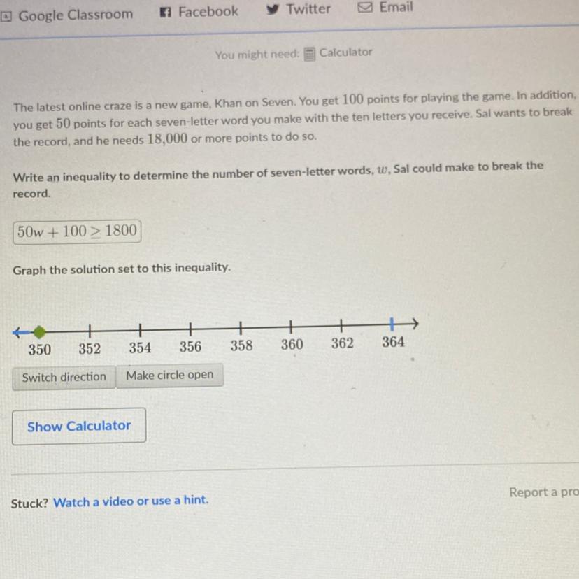 W is greater or equal to 34. Buuut I think you got the inequality was wrong so the actual equation was 18000 not 1800. So the actual answer would be w is greater or equal to 358.