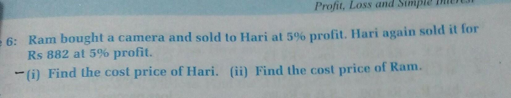 Step-by-step explanation: We start by working back with the profit made by Hari which is given as RS 882. What this means is that after selling the camera Ram has RS 882 which is made up of the cost price plus the profit or we can denote this figure as 105%.
