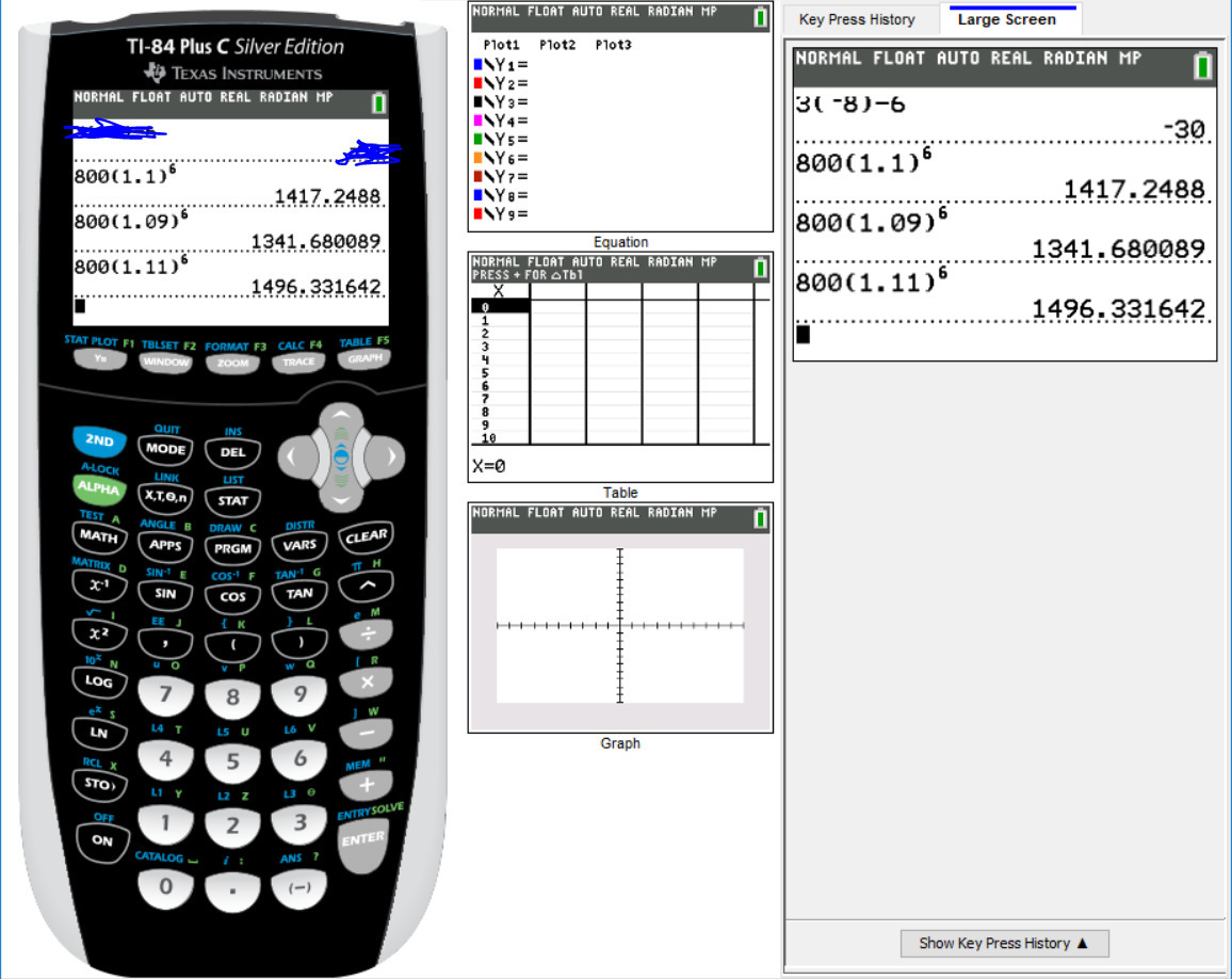 So essentially, your initial amount is 800, your interest is 0.11, 0.10, 0.09, and your time is 6. So you plug those values in and you can find your answers