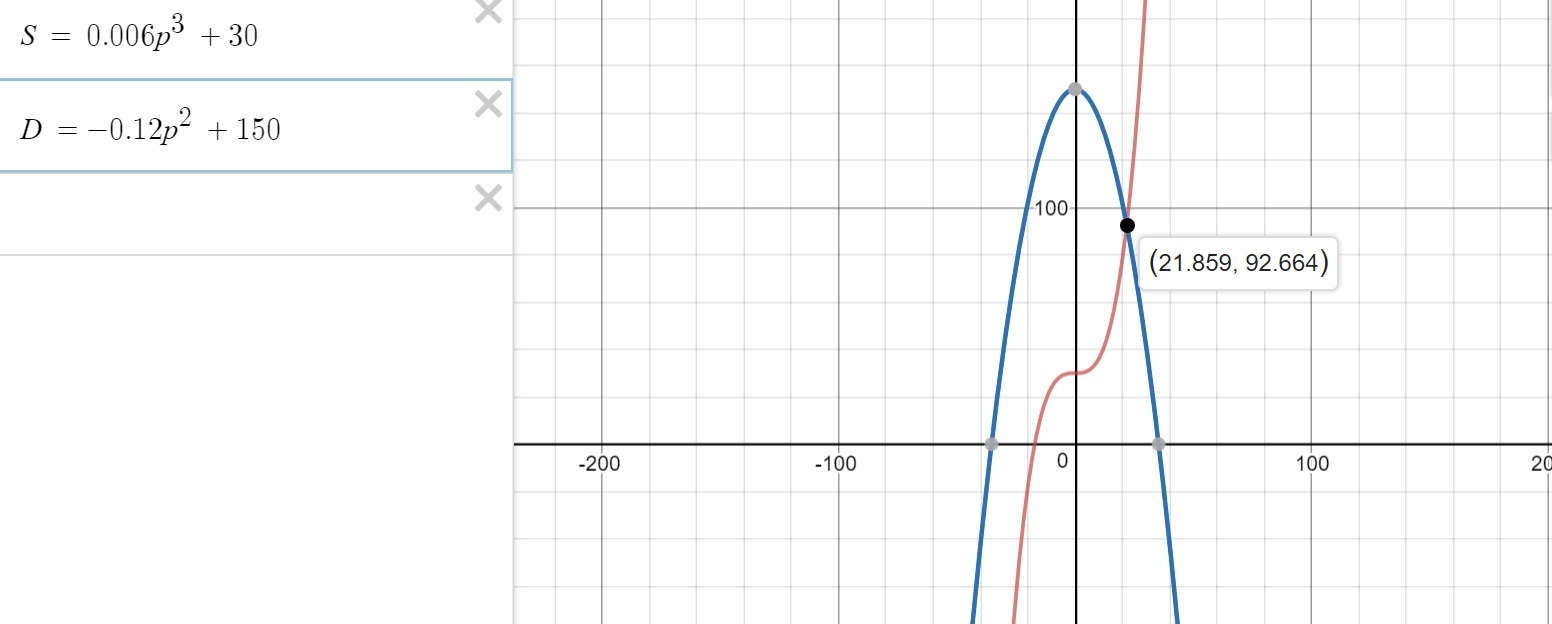 and function is D(p) = 150 - 0.12p2, where p is the price. Determine the price for which the supply equals the demand.