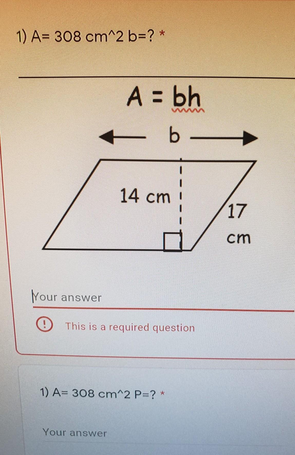 A= 308 cm^2 b=? *A=308cm^2 P=?need help in these problems