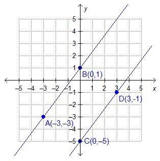From the image attached below, line 1 passes through points A = (-3, -3) and point B = (0, 1) while line 2 passes through point C = (0, -5) and point D = (3, -1).