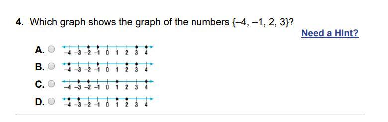 Which graph shows the graph of the numbers {–4, –1, 2, 3}?
