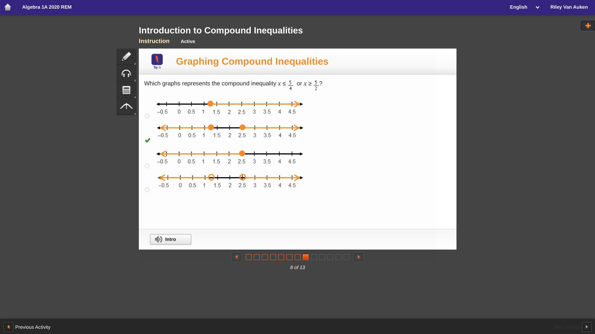 Orr problem has 2 separate inequalities. Both are doing in different directions, hence the ≤ and ≥. This makes B automatically our answer. We can check by graphing each of the inequalities on the number line.